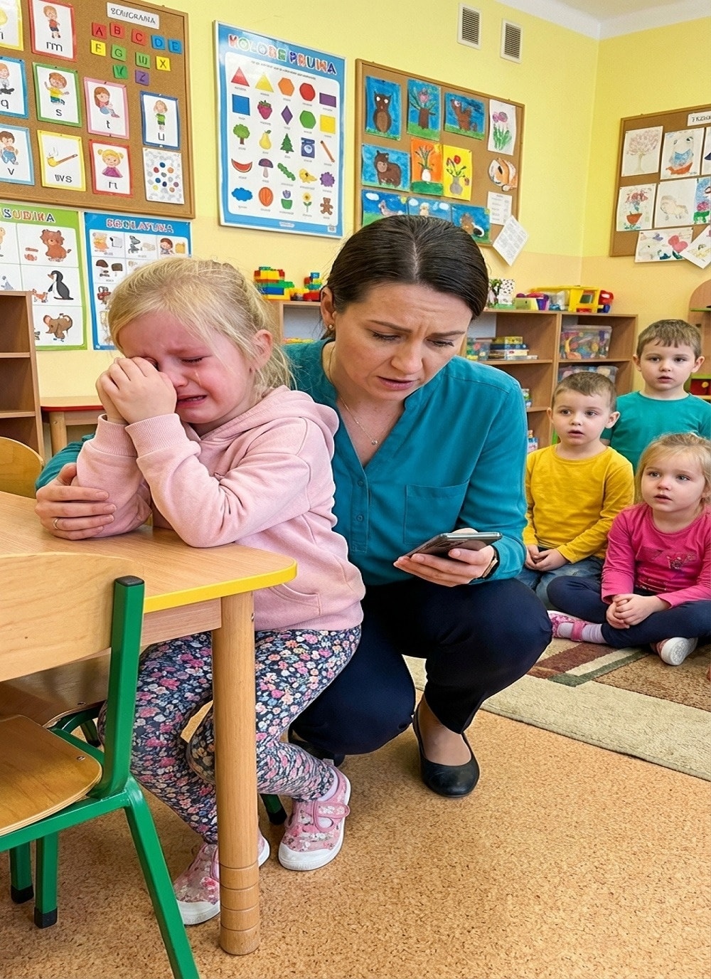 Elif yabancılardan korkarak öğretmene sarıldı.